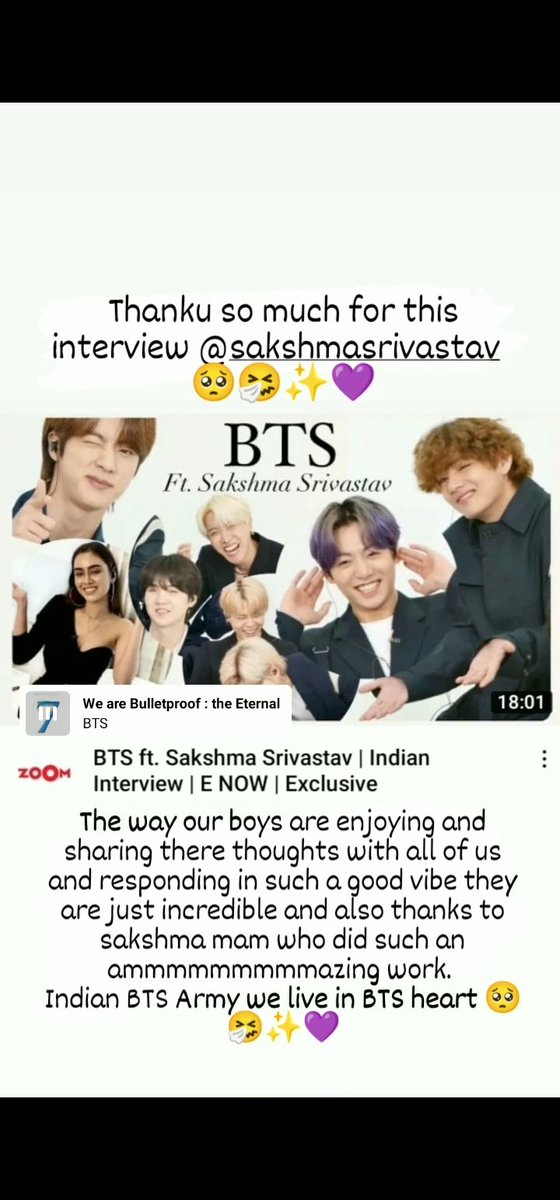 The biggest K-Pop group in the world BTS joins Sakshma Srivastav on E NOW. TIMES NOW shared a sneak peek of the BTS interview with ex-Miss India Finalist Sakshma Srivastav. Sakshma Srivastav Indian Interview E NOW Exclusive by Zoom and see the artwork lyrics and similar artists.